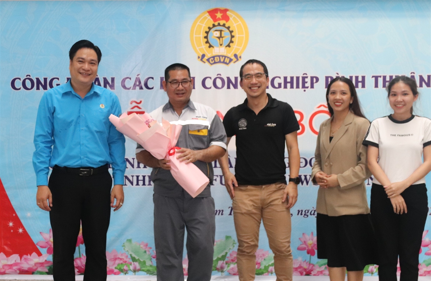 Đồng chí Trần Duy Thanh - Chủ tịch Công đoàn Các KCN tặng hoa chúc mừng Ban Chấp hành Công đoàn Công ty TNHH Shef Fung Screws Việt Nam