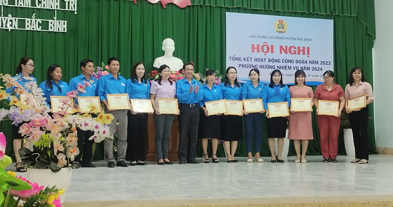 Trong không khí vui tươi, phấn khởi của cán bộ, công nhân, viên chức, lao động (CNVCLĐ) hoàn thành tốt nhiệm vụ của một năm thi đua lập thành tích chào mừng Đại hội công đoàn các cấp nhiệm kỳ 2023-2028, kỷ niệm 40 năm ngày tái lập huyện Bắc Bình (01/6/1983 - 01/6/2023) và Năm Du lịch quốc gia “Bình Thuận - Hội tụ xanh”. Ngày 05/01/2024, Liên đoàn Lao động huyện Bắc Bình đã tổ chức Hội nghị tổng kết công tác Công đoàn và phong trào công nhân, viên chức, lao động năm 2023; triển khai phương hướng nhiệm vụ năm 2024. Dự và chỉ đạo hội nghị có đồng chí Đặng Thị Thanh Hoa -Phó chủ tịch Liên đoàn Lao động tỉnh, đồng chí Bùi Tấn Vinh -Phó Bí thư Thuờng trực Huyện ủy, Chủ tịch HĐND huyện. Đồng chí Võ Văn Tiến, Chủ tịch LĐLĐ huyện chủ trì hội nghị cùng 176 đại biểu là chủ tịch (Phó chủ tịch) CĐCS và đoàn viên công đoàn được khen thưởng tham dự.