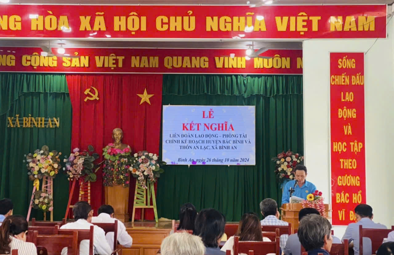 Thực hiện Hướng dẫn số 11-HD/BDVTU, ngày 10/6/2024 của Ban Dân vận Tỉnh ủy việc thực hiện công tác kết nghĩa giữa các cơ quan, đơn vị với các xã thuần, thôn xen ghép vùng đồng bào dân tộc thiểu số trên địa bàn tỉnh; Thông báo số 1065-TB/HU, ngày 31/7/2024 của Ban Thường vụ Huyện ủy phân công thực hiện công tác kết nghĩa; Ban Thường vụ Liên đoàn Lao động Huyện đã tổ chức Lễ Kết nghĩa giữa Liên đoàn Lao động huyện, Phòng Tài chính-Kế hoạch với thôn An Lạc, xã Bình An với nhiệm vụ xây dựng mối quan hệ đoàn kết thống nhất, hiểu biết, giúp đỡ vùng đồng bào dân tộc thiểu số; tuyên truyền, vận động Nhân dân vùng đồng bào thực hiện tốt chủ trương của Đảng, chính sách, pháp luật của Nhà nước, phát huy sức mạnh đại đoàn kết toàn dân tộc, đẩy mạnh thực hiện Cuộc vận động "Toàn dân đoàn kết xây dựng đời sống văn hóa” ở khu dân cư, huy động nguồn lực xây dựng thôn vùng đồng bào ngày càng phát triển, góp phần bảo đảm an ninh chính trị, trật tự an toàn xã hội, xây dựng chuẩn nông thôn mới.