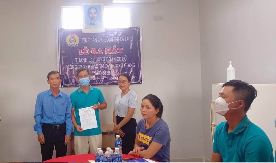 Sáng ngày 28/5/2022, tại Công ty TNHH SX TMDV Hương Giang có trụ sở tại xã Tân Bình, thị xã La Gi. Ban Thường vụ Liên đoàn Lao động thị xã La Gi tổ chức Hội nghị thành lập công đoàn cơ sở Công ty TNHH SX TMDV Hương Giang dự hội nghị thành lập công đoàn cơ sở, có Đồng chí Lê Ngọc Thơm – Phó Chủ tịch LĐLĐ thị xã La Gi và đại diện người lao động của công ty.